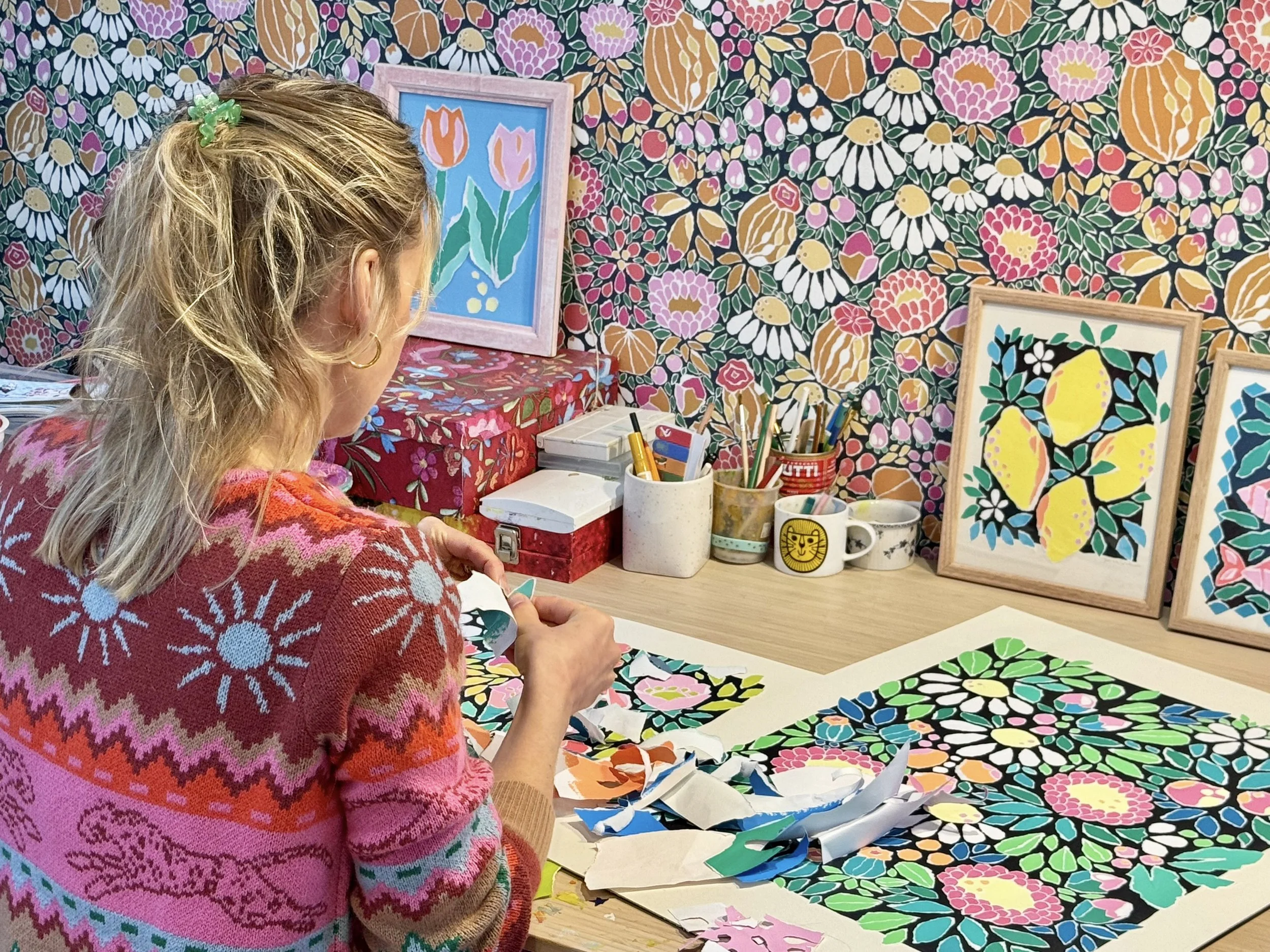 I have always had a fascination with pattern and colour and love to create art pieces using a vivid palette with the intent of sparking joy in the viewer. All of my artworks and patterns begin by painting several sheets of paper in various colours. I then tear up the paper into numerous small pieces and arrange them to create the design. The act of ripping rather than cutting always produces unexpected results which I love!